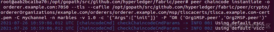 peer chaincode instantiate -o orderer.example.com:7050 --tls --cafile /opt/gopath/src/github.com/hyperledger/fabric/peer/crypto/ordererOrganizations/example.com/orderers/orderer.example.com/msp/tlscacerts/tlsca.example.com-cert.pem -C mychannel -n marbles -v 1.0 -c '{"Args":["init"]}' -P "OR ('Org1MSP.peer','Org2MSP.peer')"