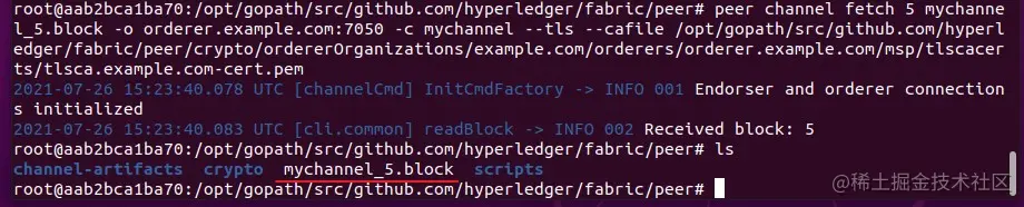 peer channel fetch 5 mychannel_5.block -o orderer.example.com:7050 -c mychannel --tls --cafile /opt/gopath/src/github.com/hyperledger/fabric/peer/crypto/ordererOrganizations/example.com/orderers/orderer.example.com/msp/tlscacerts/tlsca.example.com-cert.pem