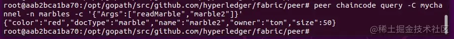 我们将同样按照其他节点创建和加入通道步骤进行操作,当 peer1.org2.example.com 节点加入到了通道后,就可以与marbles02 链码交互: