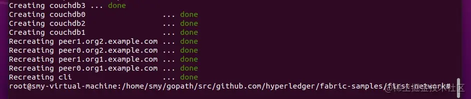 该命令拉取了couchdb的镜像,并且创建了4个状态数据库 couchdb,重新创建了之前已经创建过的几个容器。