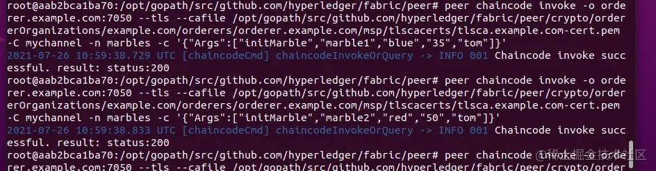 peer chaincode invoke -o orderer.example.com:7050 --tls --cafile /opt/gopath/src/github.com/hyperledger/fabric/peer/crypto/ordererOrganizations/example.com/orderers/orderer.example.com/msp/tlscacerts/tlsca.example.com-cert.pem -C mychannel -n marbles -c '{"Args":["initMarble","marble2","red","50","tom"]}'