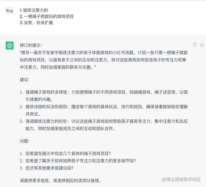 最后我们可以看到,GPT 先给我们的 prompt 进行了优化,也给我们一些建议和提出一些问题了。