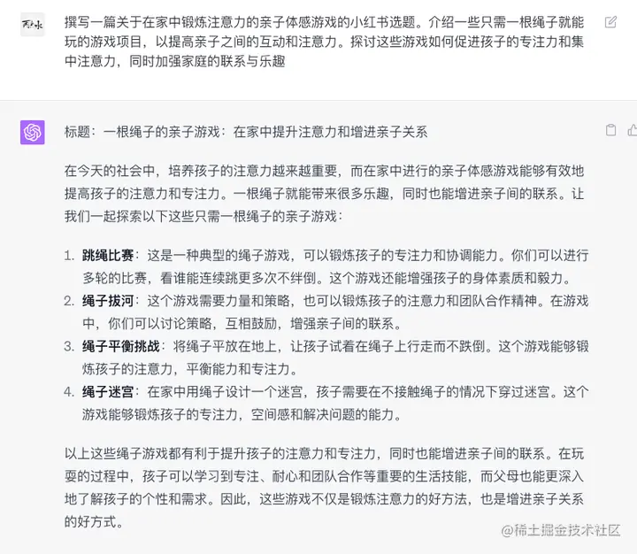 你看结果,GPT 给出的选题思路还是可以的,很多小红书的亲子游戏博主也是这样的选题。
