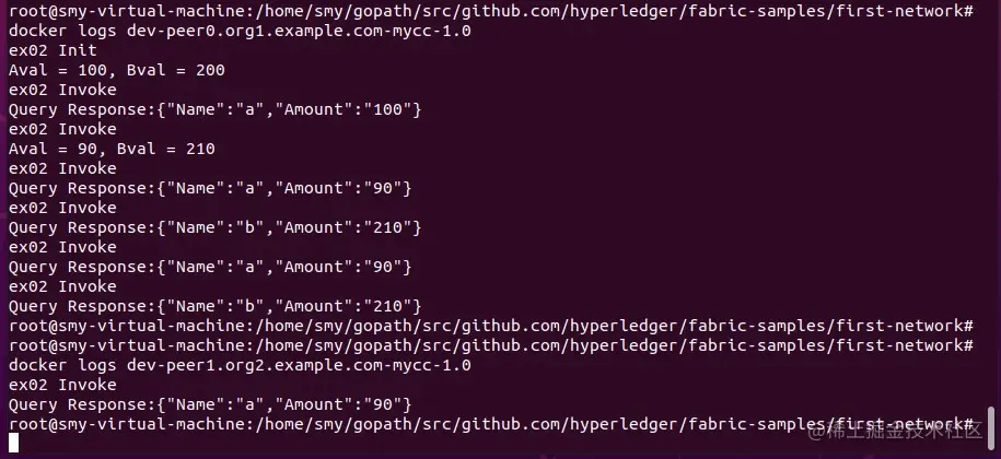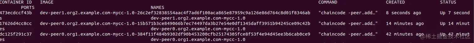 假设我们在 peer0.org1.example.com 安装并实例化了链码,然后在 peer1.org1.example.com 安装了链码,那么此时已经启动了两个链码容器。此时如果我们以安装了链码的节点 peer1.org2.example.com 发送对 “a” 值的查询时,将默认启动第三个链码容器(名为 dev-peer1.org2.example.com-mycc-1.0)。