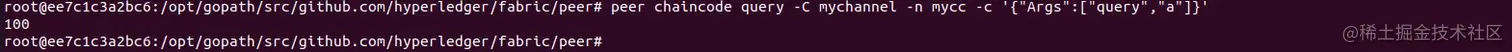 让我们查询 a 的值,以确保链码被正确实例化并且向状态数据库写入了数据。查询的语法是这样的:
