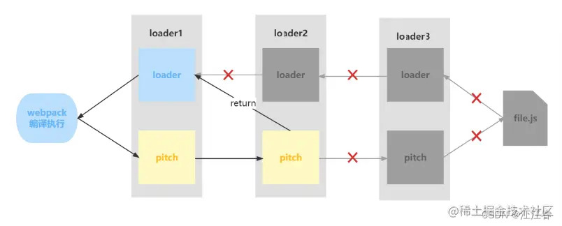 在这个过程中如果任何 pitch 有返回值,则 loader 链被阻断。webpack 会跳过后面所有的的 pitch 和 loader,直接进入上一个 loader 。编辑