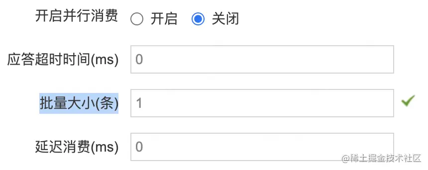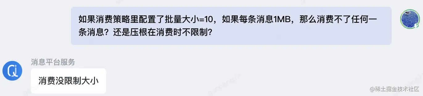 对于京东物流绝大部分业务系统来讲,这点提升与繁重的业务处理来比不值一提,例如:I/O节省了5ms,但单个消息处理需要200ms(因为要通过接口查询,处理,然后写库),反倒是side effect成为主要矛盾。因此,绝大部分场景下该值应该设置为1。如果业务逻辑类似于集齐:把N个消息拿下来,本地缓冲暂不处理,等满足条件了再merge并一次性处理,那么可以调整批量大小为非1。