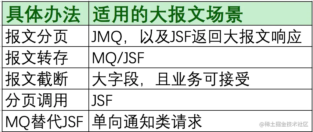 有些大报文问题,可能暂时无法通过技术手段解决,例如,已经有商家接入的对外接口,开放时没有对List size限制,加限制后需要商家配合修改做客户端分页,而商家不配合。这时候,可以采用大促期降级,限流,加开关,加强监控,设计应急预案,为此接口提供独立的线程池来隔离正常请求等手段解决。