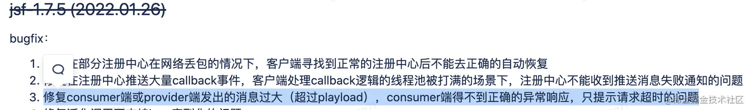 📌 经与JSF团队确认,consumer端或provider端发出的消息过大(超过playload)时consumer端得不到正确的异常响应只提示请求超时的问题,已经在1.7.5版本修复:需要provider端升级。升级后,如果consumer端发送的消息过大,provider会立即响应RpcException。