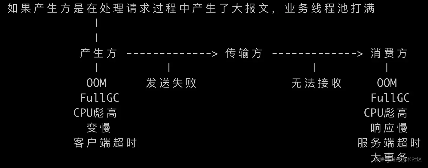 对于大报文的产生方,过大的报文在序列化时消耗更多内存和CPU,在传输时(JSF/MQ)可能超过中间件的大小限制导致传输失败;对于大报文的消费方,过大的报文在反序列化时会产生大对象,消耗更多的内存和CPU,容易触发FullGC甚至OOM,而在处理过程中要遍历的内容更多,造成响应变慢,如果涉及数据库操作容易产生大事务、慢SQL,这些容易触发超时,如果客户端有重试机制,会进一步加重大报文消费方负载,严重时导致服务集群整体不可用。
