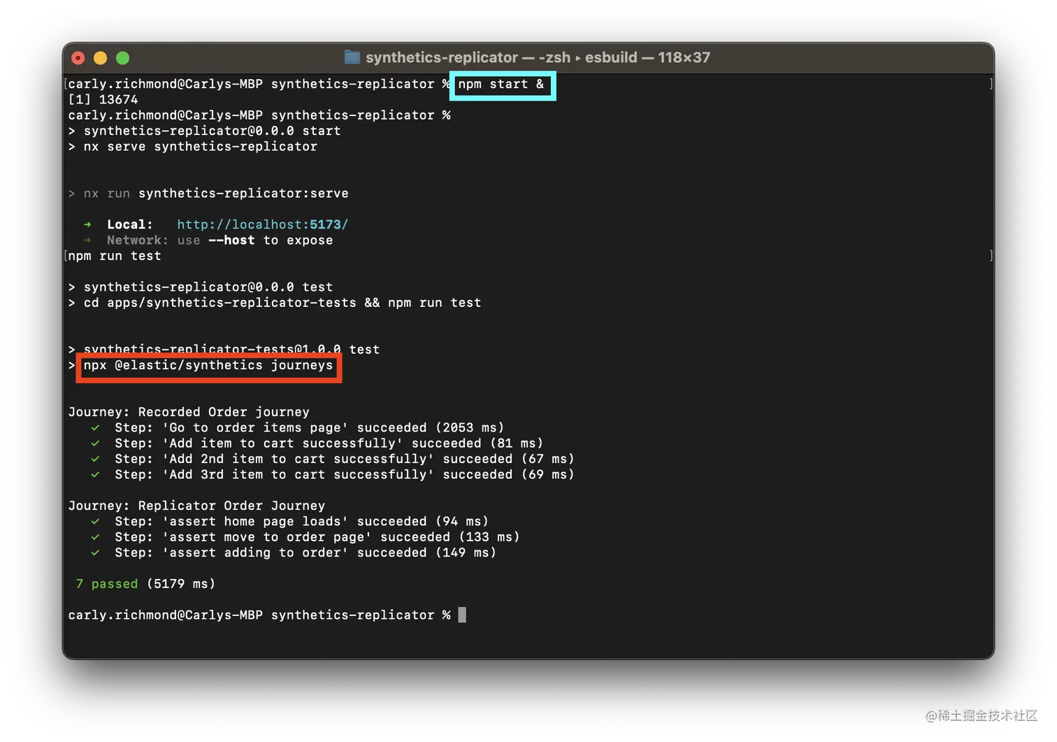 作为功能开发的一部分,开发人员可以针对本地运行的应用程序执行测试,以查看用户工作流中成功和失败的步骤。在下面的示例中,在顶部用蓝色框标出的部分是本地服务器的启动命令。在下方用红色框标出的部分是监测器的执行命令。