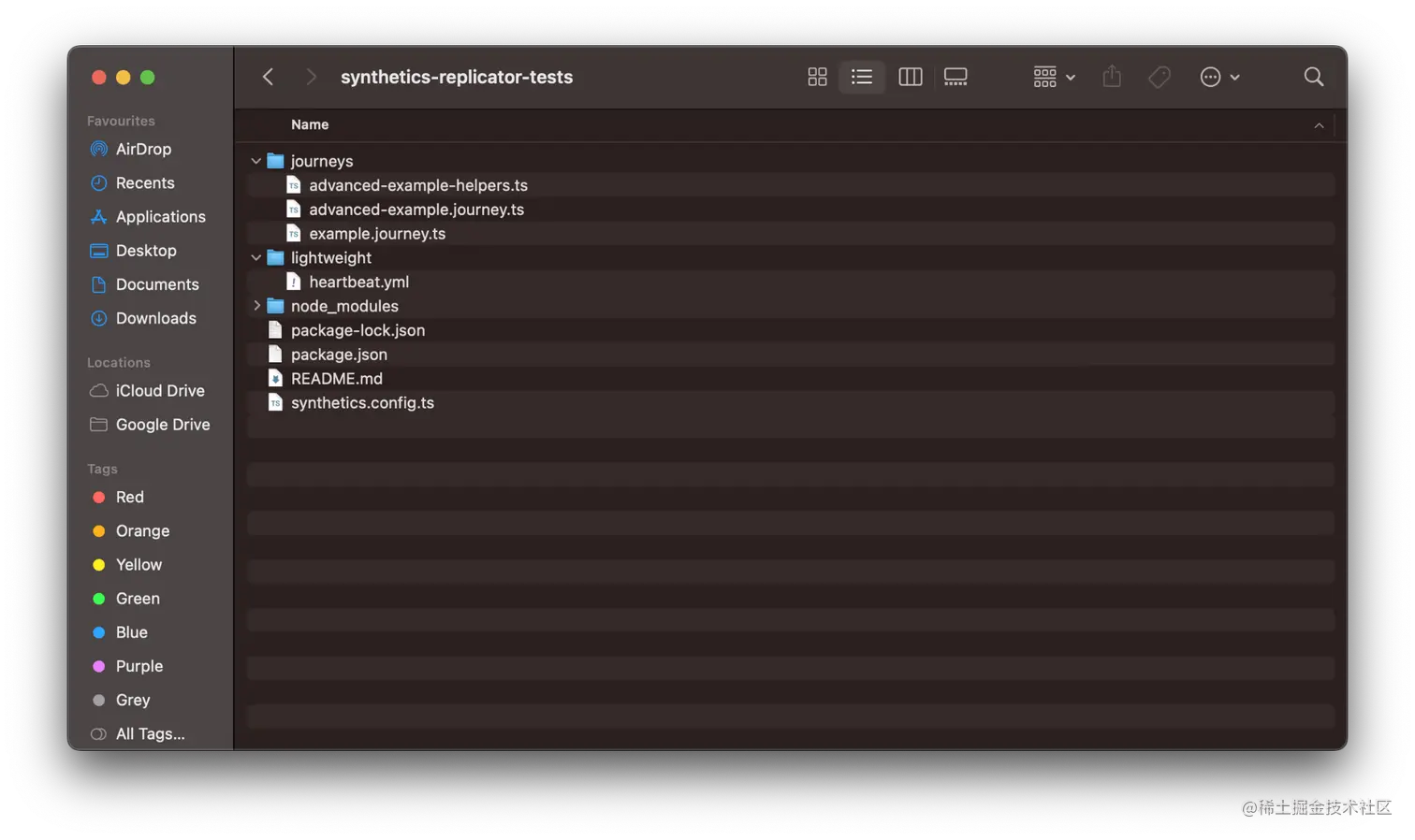 对于 Web 开发人员来说,他们对 README、package.json 和锁文件等大多数元素都会很熟悉。监测器的主要配置可在 synthetics.config.ts 中找到,如下文所示。这项配置可以进行修改,以包括特定于生产和开发的配置。这对于合并各工具和重复使用相同的监测器进行端到端测试,以及允许任何旅程用作端到端测试和生产监测器,都是至关重要的。虽然这个示例中并未包括私有位置的详细信息,但如果您希望从自己的专用 Elastic 实例(而不是从 Elastic 基础架构)进行监测,也可以将这些信息包含进来。