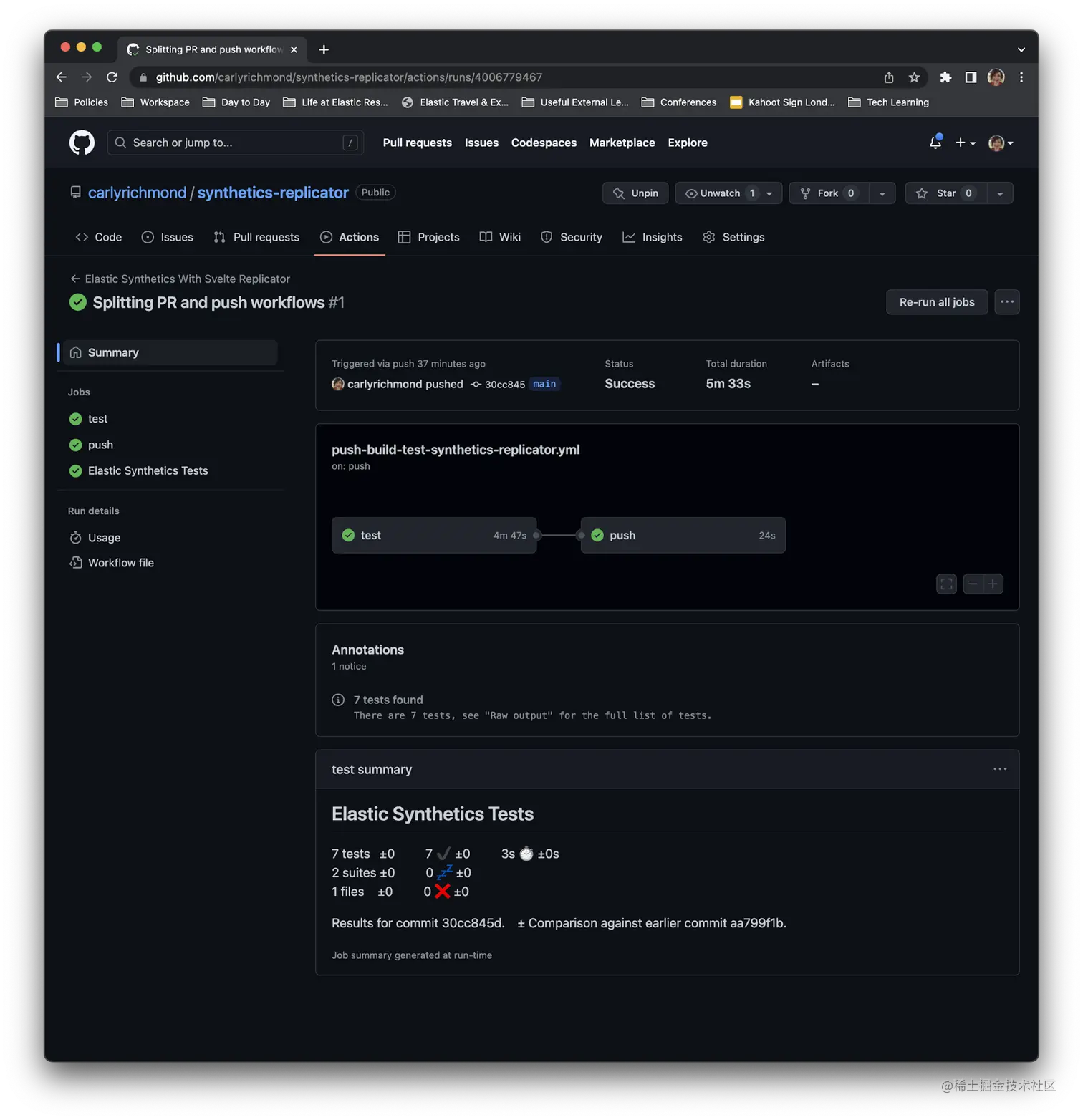 为了确保在 Elastic 运行状态监测中提供最新的监测器,建议将监测器作为 CI 工作流的一部分以编程方式进行推送,如下面的示例任务所做的那样。我们的工作流有第二个作业 push(如下图所示),这取决于我们成功执行了将监测器上传到集群的 test 作业。请注意,在我们的工作流中,这个作业被配置为在推送时运行,以确保更改得到验证,而不仅仅是在拉取请求中引发。