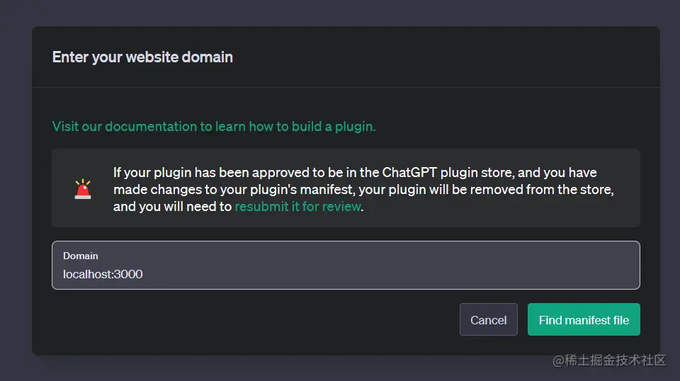 进入chat.openai.com,在你的账户中打开一个新的聊天窗口。点击GPT-4下拉菜单,Plugins > Plugin Store > 点击Develop Your Own Plugin > 输入localhost:3000 > 点击Find manifest file。