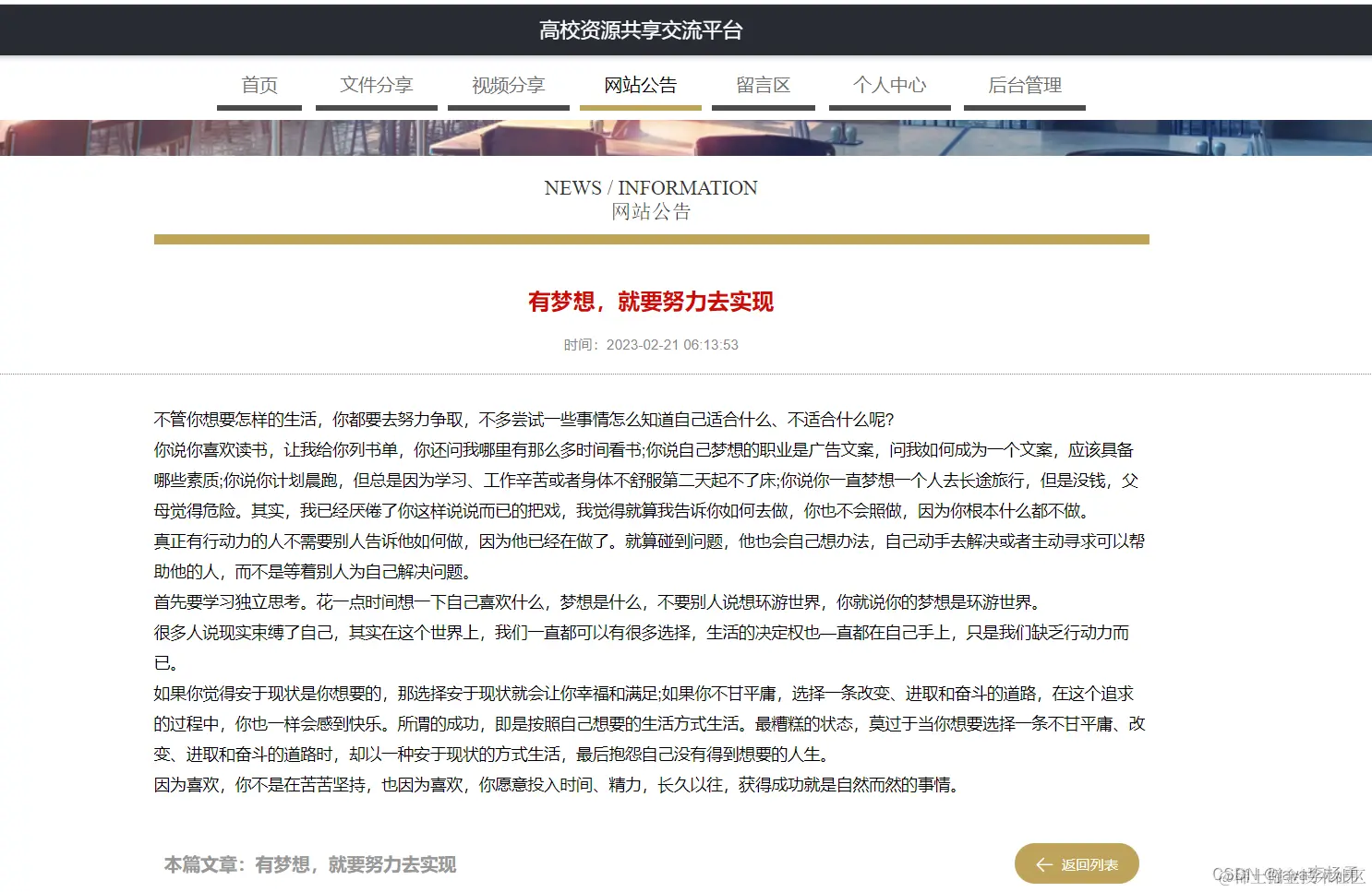 高校资源共享交流平台的开发一方面是对自身专业知识技能进行最终考核,另一方面也是让自己学会独立解决程序开发过程中所遇到的问题,掌握将理论知识运用于程序开发实践的方法。学习交流分享系统的开发最终目标就是让系统更具人性化,同时在逻辑设计上,让系统能够更加的严谨。