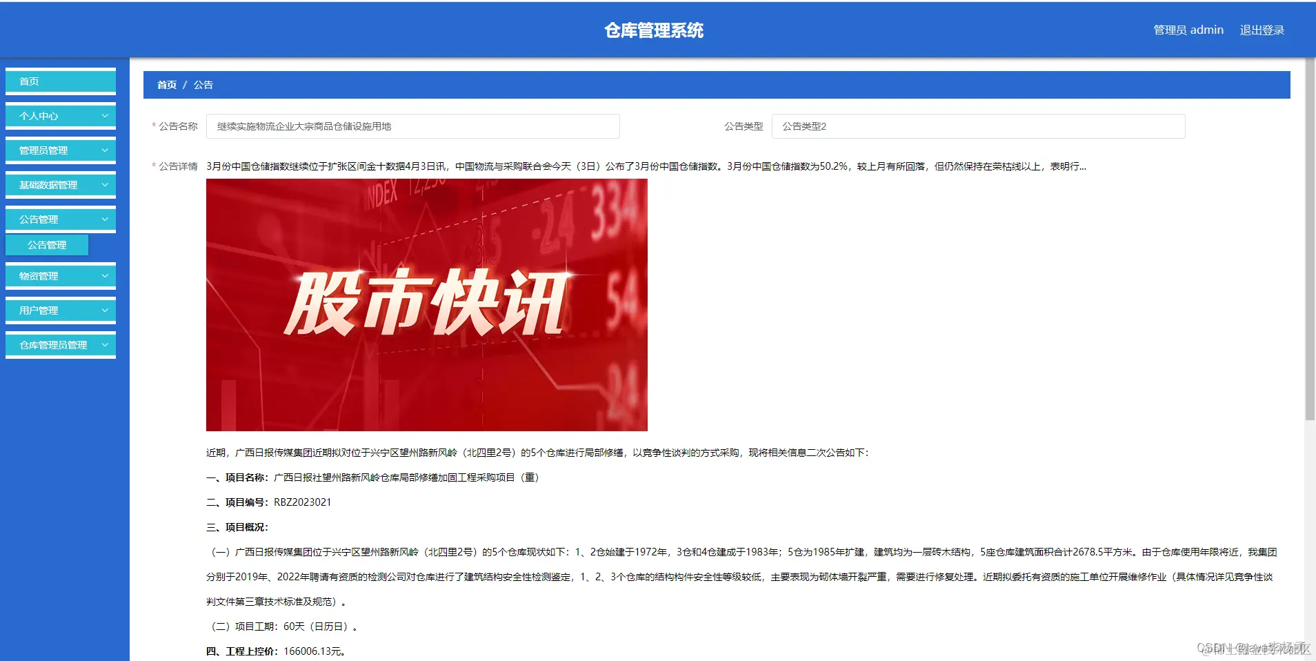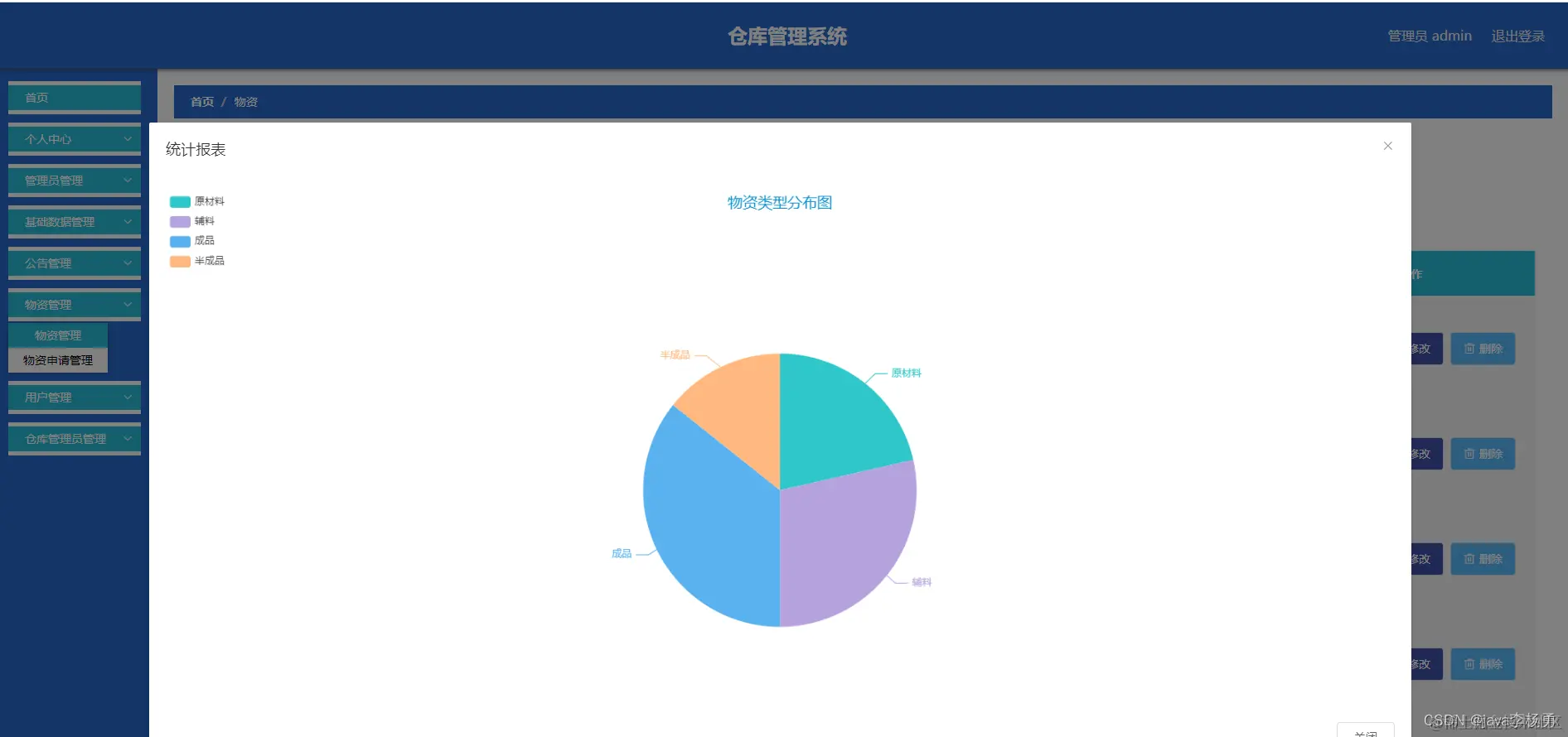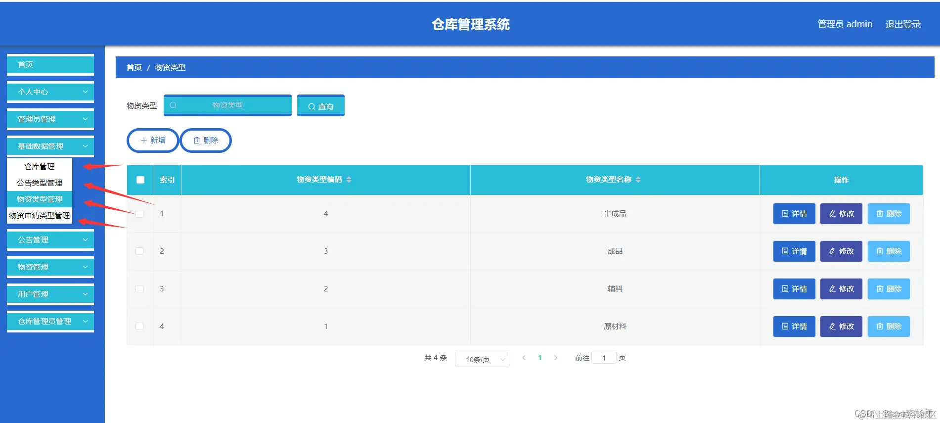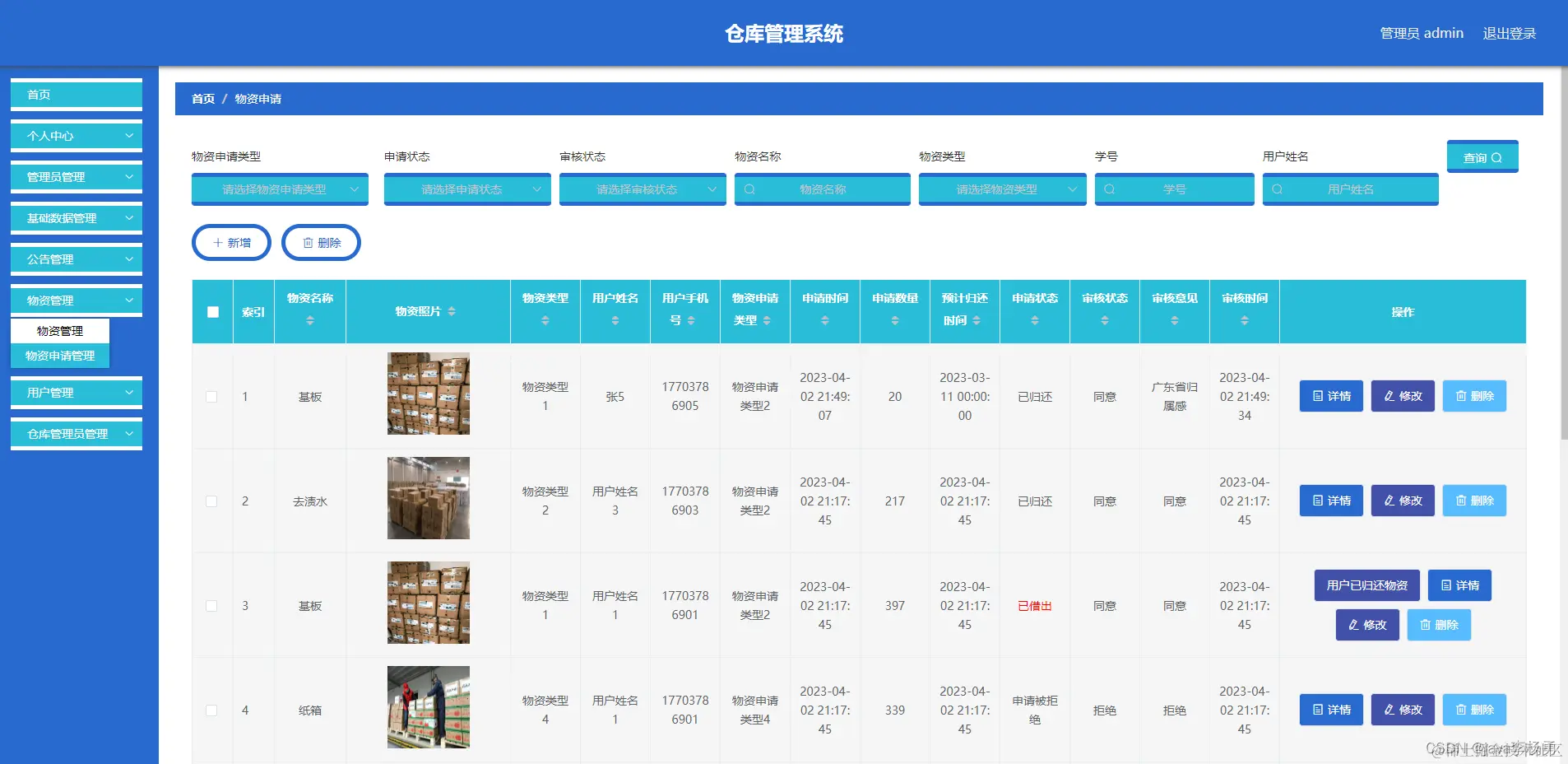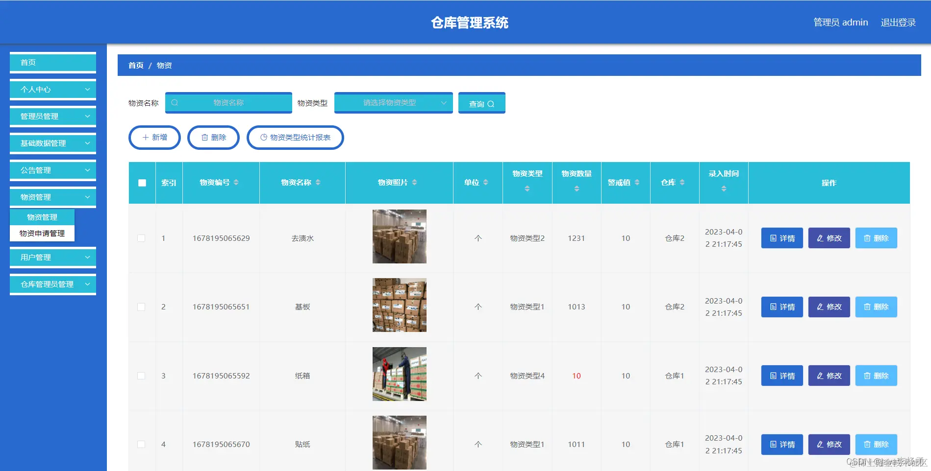 此页面让管理员管理物资的数据,物资管理页面见下图。此页面主要实现物资的增加、修改、删除、查看的功能