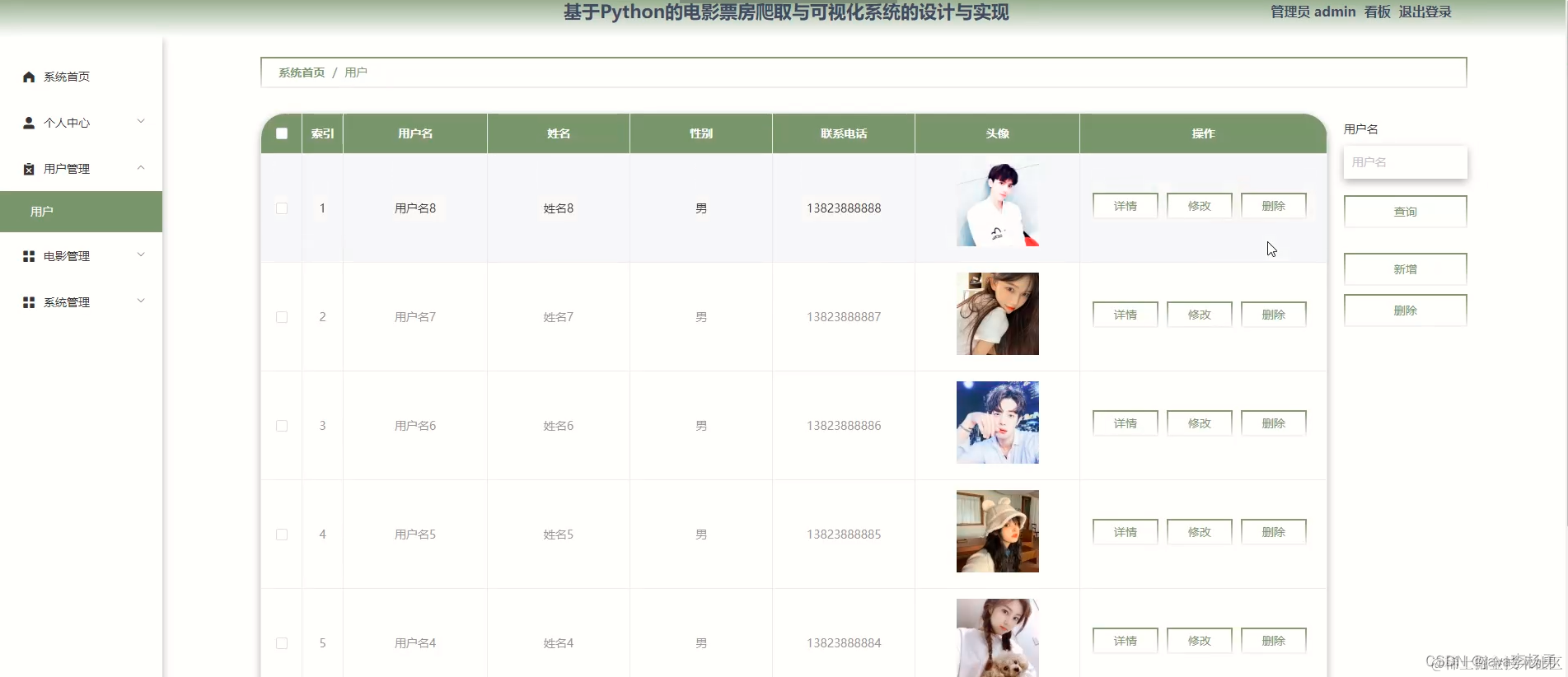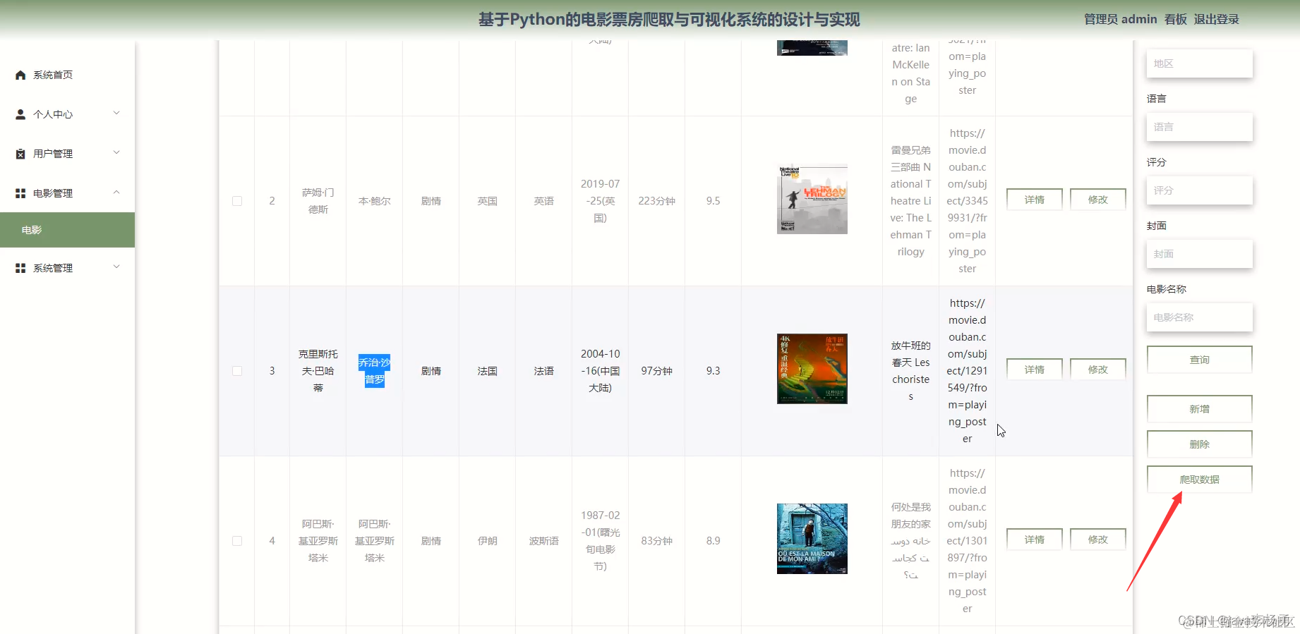 系统阐述的是一款电影票房爬取与可视化系统的设计与开发,在此系统的开发过程中应用到Python、MySql技术和面向接口编程。在系统的开发中应用B/S结构设计开发实现,让系统之间逻辑分层清晰明确使得系统更加的合理可靠,毕设就是检验我们对所学内容运用程度的时刻,对所学内容运用情况进行巩固与提高。本系统检验了自己的IT知识,同时也检验了自己运用相关知识去解决实际问题,使自己得到了一个锻炼与提升编程技能的机会。在设计上我遇到了很多困难,主要原因是我所拥有的知识不是很扎实,所以只靠几本书里的知识是远远不够的!自己经过实践取得了一些实践经验。知识不在于理解,必须学会运用,并且使之反映到实际生活中去,才是学知识的根本目的。面对困难,我学着怎样去处理,怎样去发现并分析有关的资料,此次实践使我在实际应用中有所提高,同时极大地增强了大脑的工作能力,使我在探索中获得快乐,在成功中获得幸福,是我莫大的财富。后期也将继续对系统做出进一步的优化升级。