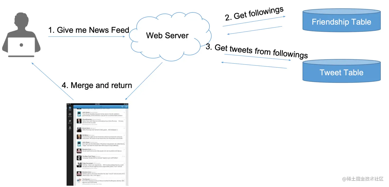- 在用户查看News Feed时,获取每个好友的前100条Tweets,合并出前100条News Feed