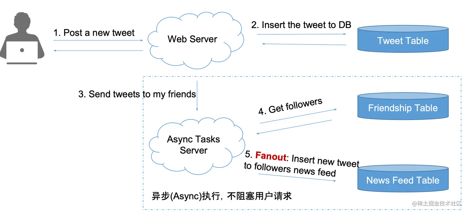 用户发一个Tweet之后,将该推文逐个推送到每个用户的News Feed List中