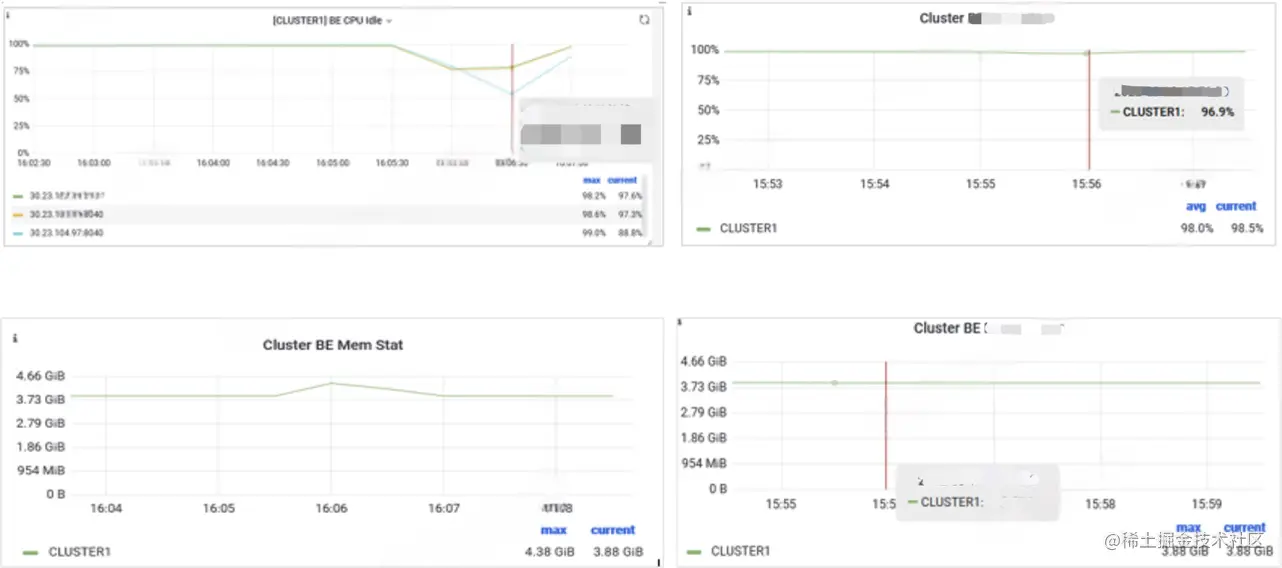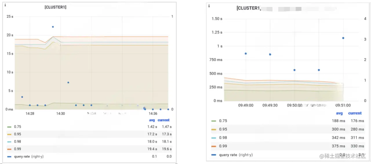 同时,我们借助 Grafana 查看 Apache Doris 查询性能,发现宽表构建的方案能够使查询时间从原来的十多秒缩短至百毫秒内,服务器也不再出现抖动的情况。