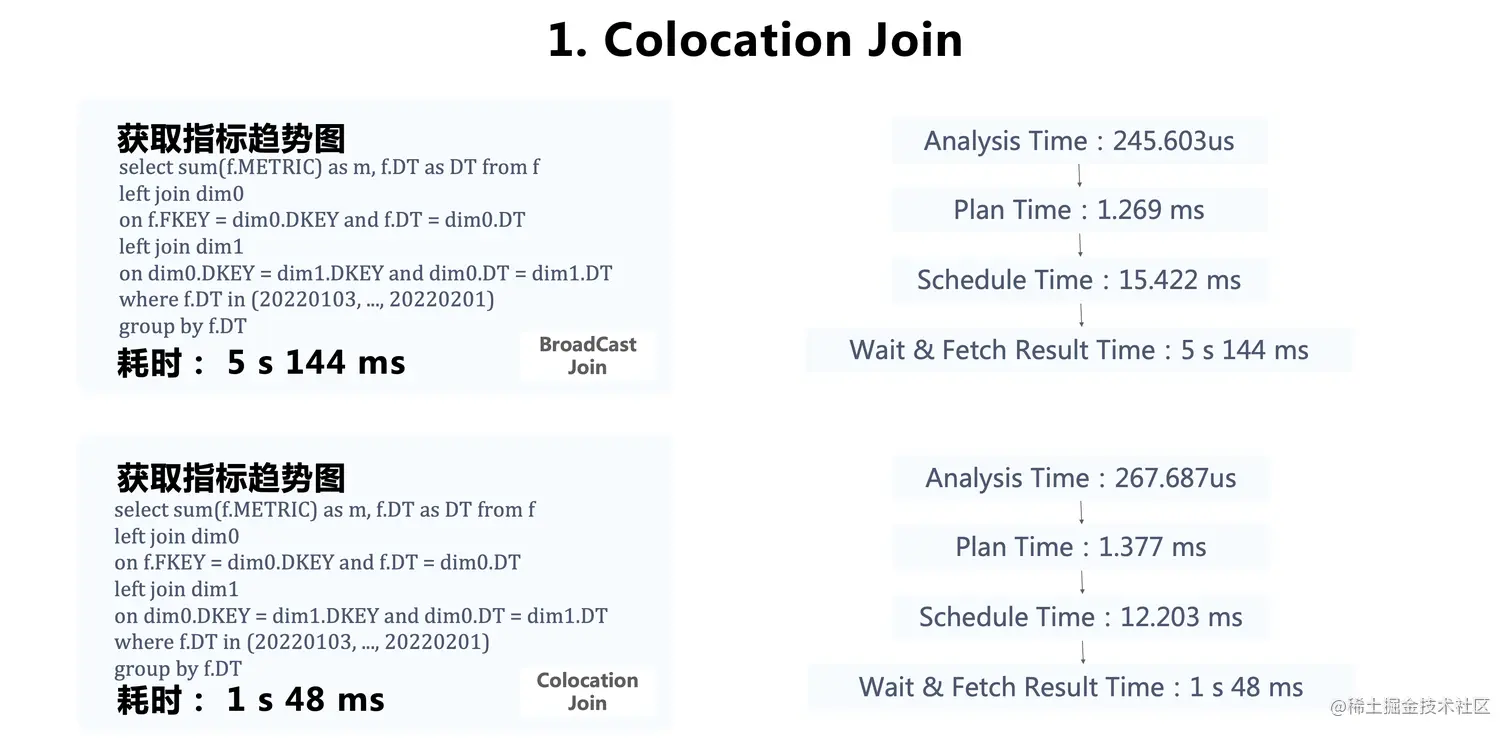 我们将 SQL 查询执行时间进行了统计,如上图所示在采取方案一 Colocation Join 的方式时,查询响应时间从之前的 5 秒提升至 1 秒。虽然查询效率有所提升,但是我们希望能够更进一步缩短响应时间,完成预期目标。在采用方案二来调整数据模型后,SQL 执行时间从原来的 5 秒达到 63 毫秒响应时间,查询响应时间得到显著提升,满足我们对查询响应毫秒级的目标。