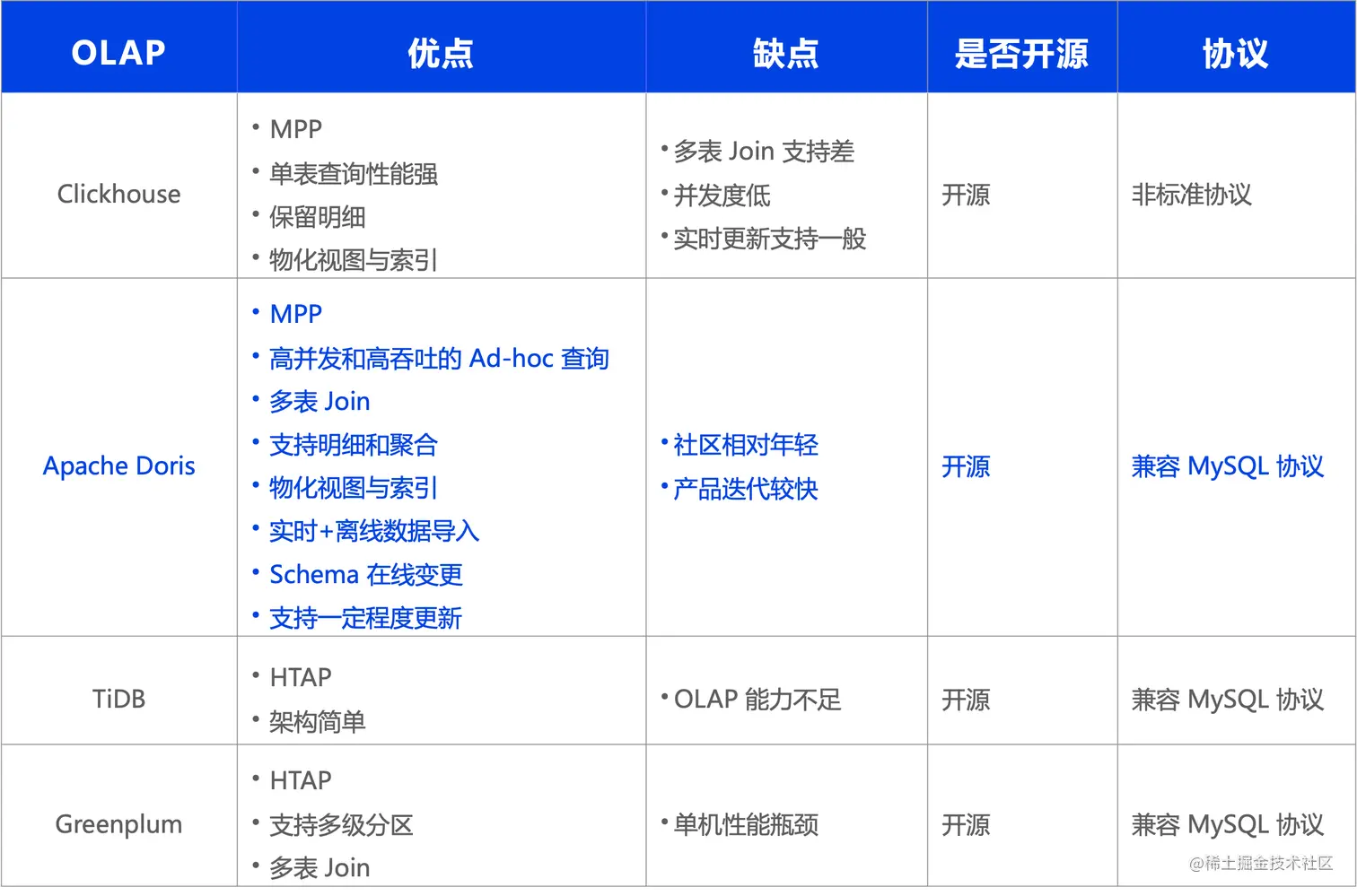 基于第一代架构的使用经验,我们急需找到一个既可支持指标多表关联查询的场景,又可以达到降本增效的 OLAP 引擎。 带着这样的诉求,我们对比了当下比较热门的 OLAP 引擎进行系统选型,从多表关联场景、使用协议、使用成本、金融应用场景与案例四大方面进行比较。