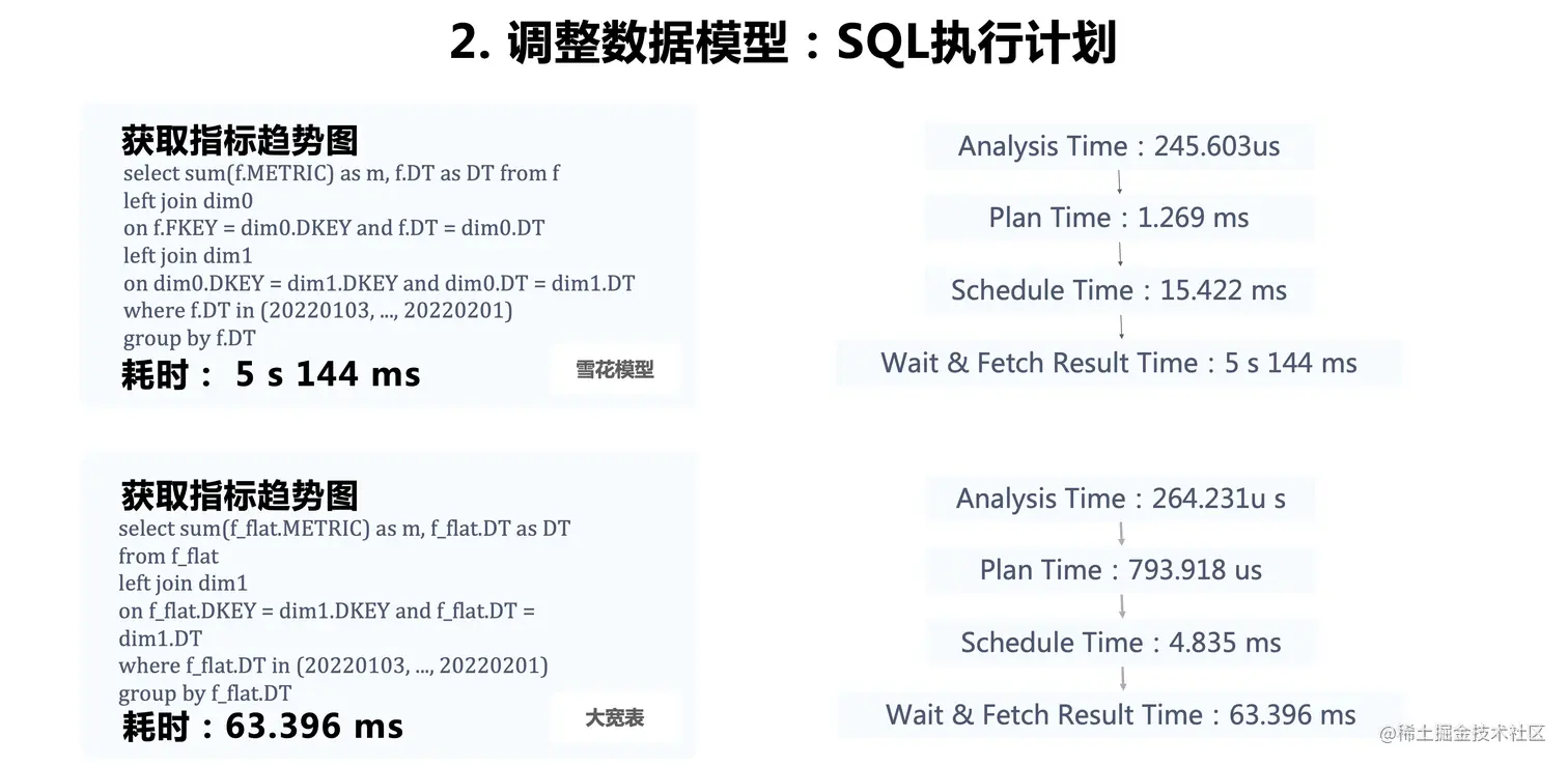 在准备工作完成后即可开始进行大表关联查询,我们选择了耗时较长的 SQL 来查询指标趋势图。基于毫秒级查询目标,我们实施了两个优化解决方案。第一个方案是利用 Colocation Join 将数据在建表时提前聚合。第二个方案是借助 Audit Loader 的方式收集高频 SQL,反向优化数仓的表构建以及改写 SQL,使用偏宽表设计代替之前的星型 / 雪花模型。通过两个方案的测试与评估,我们发现第二个方案能够在查询响应、服务资源节省中达到更加显著的收益。