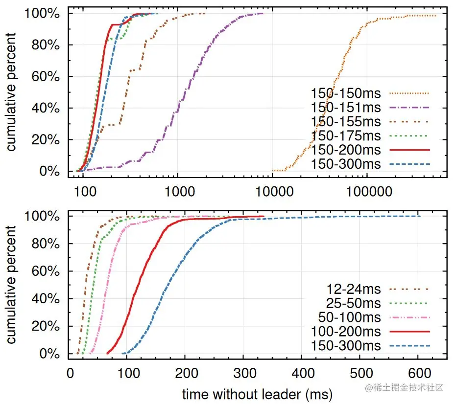 - 横坐标代表着发现到替换掉宕机leader开始服务的时间。数值的单位为毫秒。