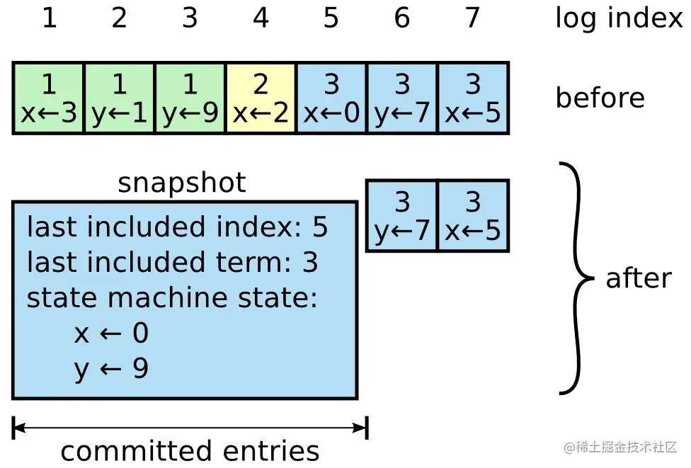 可以看到,Raft算法的核心就是leader选举以及日志复制。而日志的无限增长,必然带来性能问题,这是从工程角度必须解决的问题。日志表示的是过程,状态数据库表示的是结果;同样,我们可以定期把某一时间点之前的日志做成状态数据库,或者称为快照,仅保留该时间点后的日志,这样就可以大幅减少日志的数量。如下图所示:在上图中,原先的已经被提交的5条日志最终导致的状态是x=0&&y=9,故可以被快照替代,这便减少了日志量。