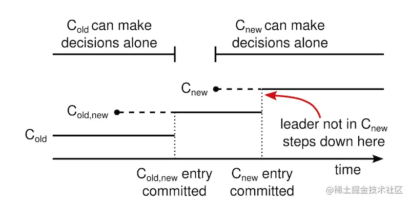 - 之后,leader开始复制日志C(new),从这一刻起leader的新配置开始生效。