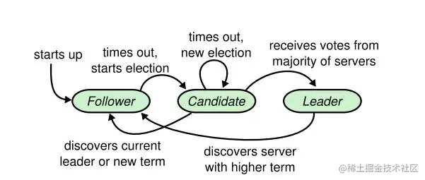 - 当集群内没有leader节点时,leader节点被多数节点选出来。比如集群有3个节点,那么2个节点同意的话,就可以选出1个作为leader;
