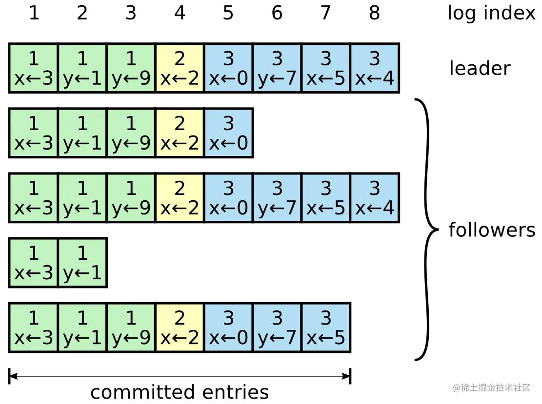 leader需要把写日志同步到大多数follower后才能更新状态数据库,并向client回复写成功。如果没有得到多数follower的成功应答,leader会重复发送这条日志更新请求。下图中有8条日志3个任期5个节点,每条日志里除记录了操作行为外还记录了当时的任期:上图中,绿色是第一个任期,其中3条日志条目中第3条日志y=9没有被第4个节点接收到。黄色是第2个任期。绿色与黄色任期内,所有的日志皆被多数节点收到,因此都是写入状态数据库的,这些日志的状态都是commited已提交状态。蓝色是第3个任期,其第8条日志x=4没有被多数节点收到,因此该日志不是committed状态。 leader与 follower之间的日志也可能存在不一致的情况,follower或者少了一些日志,或者多了一些日志,如下图所示: