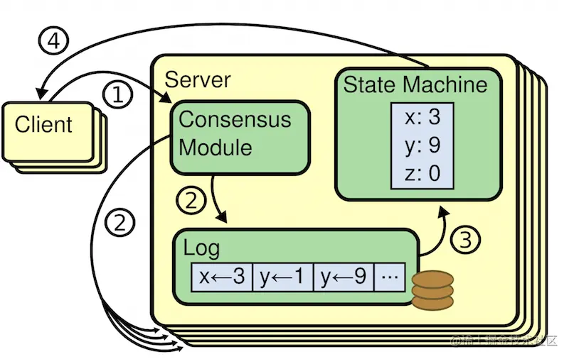 因此Raft将一致性问题转换为leader的选举上,以及leader与follower之间的数据同步。我们先来谈leader与 follower之间的数据同步问题。每一次写请求会修改数据,读请求则不会,所以把leader收到的写请求当作一次操作日志记录下来,且同时把操作日志同步给所有的follower节点,而有一个最终状态数据库记录某一个key的最终值,如下图所示(事实上这与fabric区块链里,多条交易日志构成的世界状态数据库非常相似,详情请参见《区块链开源实现hyperledger fabric架构详解》):上图中其步骤含义如下: