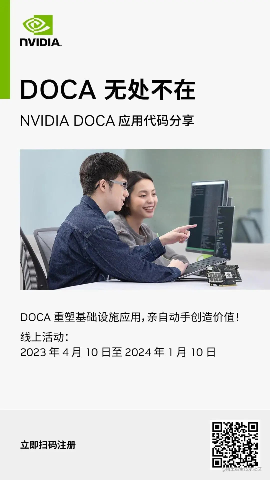 由 NVIDIA 发起并主办的“DOCA 无处不在—— NVIDIA DOCA 应用代码分享” 活动于今日开放注册,并将于 2024 年 1 月 10 日关闭注册。现诚邀广大开发者注册参加,基于 NVIDIA DOCA 软件框架开发数据中心基础设施应用程序与服务,一同为新一代 AI 驱动的数据中心、高性能计算及云计算基础设施带来前所未有的创新!