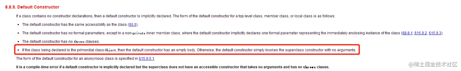 红色框内的英文翻译为:如果声明的类是原始类Object,那么默认的构造函数有一个空的主体。否则,默认构造函数只是简单地调用没有参数的超类构造函数。