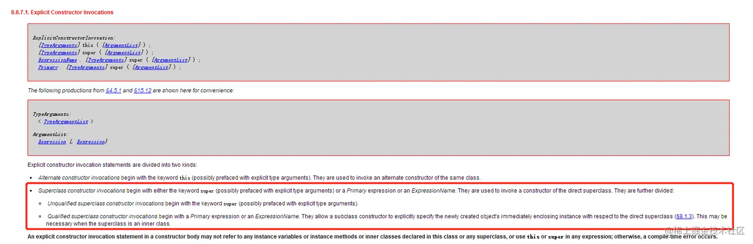 上面的意思大概就是超类构造函数通过 super 关键字调用,并且是以 super 关键字开头。