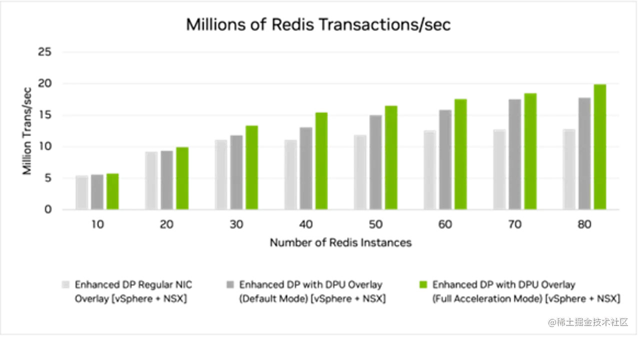 针对白皮书进行的测试在 NSX 上使用了网络加速,并使用了四层分布式防火墙的重叠网络。在 80 个 Redis 实例中使用完全 DPU 加速(具有 UPTv2 的 EDP 标准)实现了近 2000 万的 TPS。