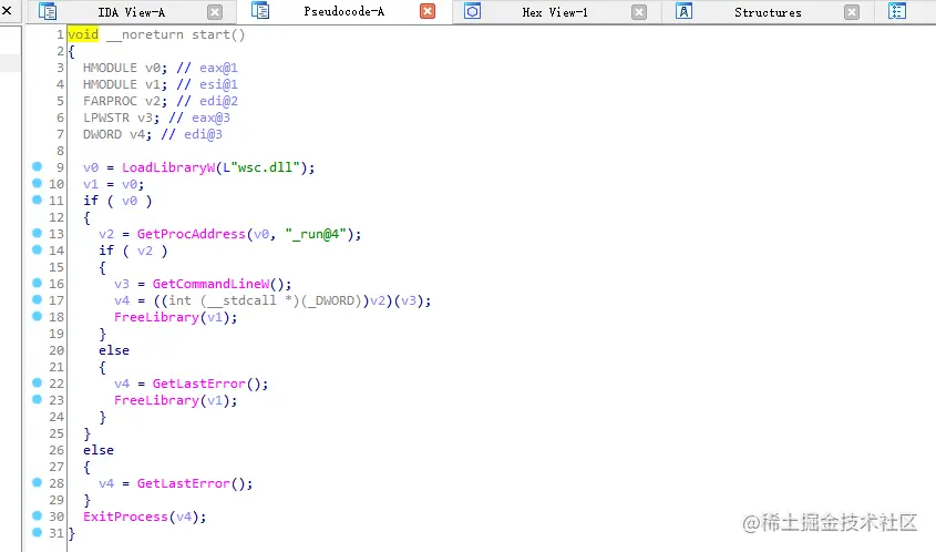 可以看到这里很纯洁,加载了wsc.dll,并调用run函数,我们继续调试wsc.dll中run函数。