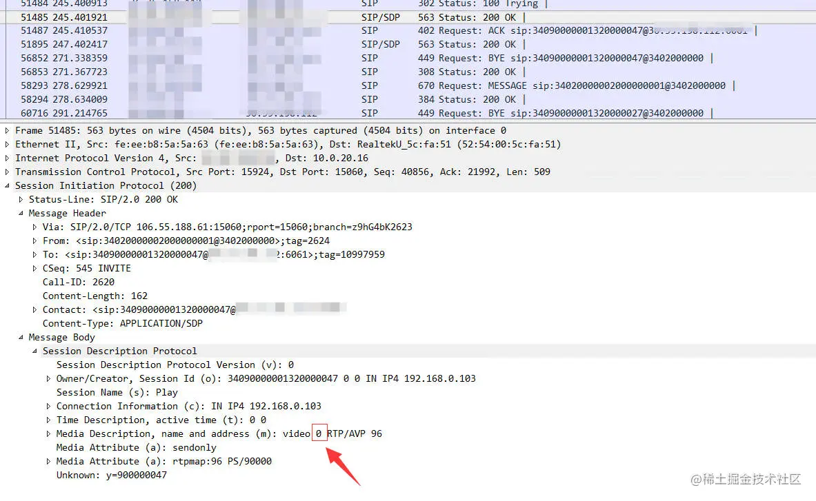 我们抓包发现,EasyCVR返回上级的发流端口是0,导致上级无法接收到视频流,因此出现无法播放视频的情况。