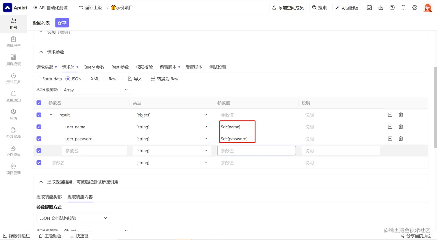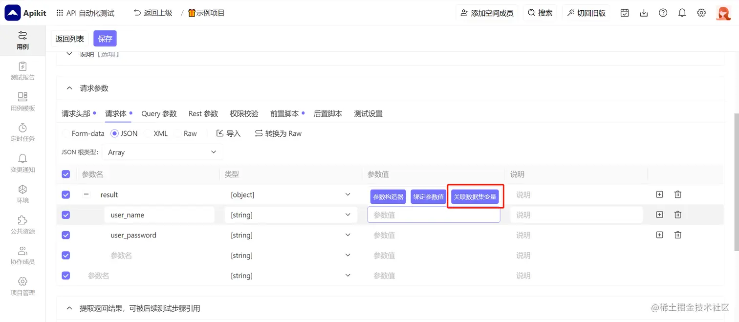 在用例的执行步骤中,您可以在请求参数、返回结果、校验规则的输入框中,将鼠标聚焦在输入框,此时输入框上方会出现 关联数据集变量 按钮,点击之后在弹窗中可以选择需要使用的数据集变量。您也可以通过手动输入 $dc{变量名} 的方式来引用变量,在测试时会自动将该变量名替换为每个数据集的实际变量值。