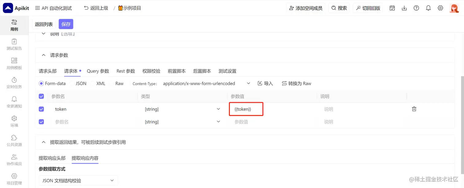 然后在请求体的表格中使用{{token}}即可引用该token值,即123456。