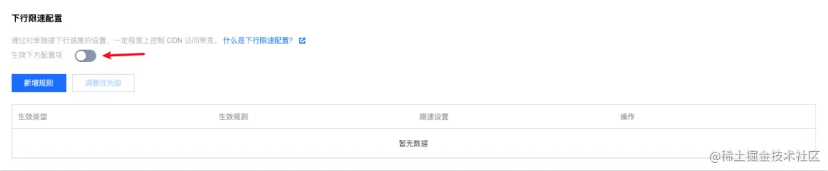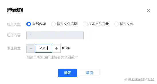 注:下行限速配置成功后,将会对访问此域名的全网用户生效,一定程度上会影响用户访问体验及 CDN 加速效果,请谨慎使用。