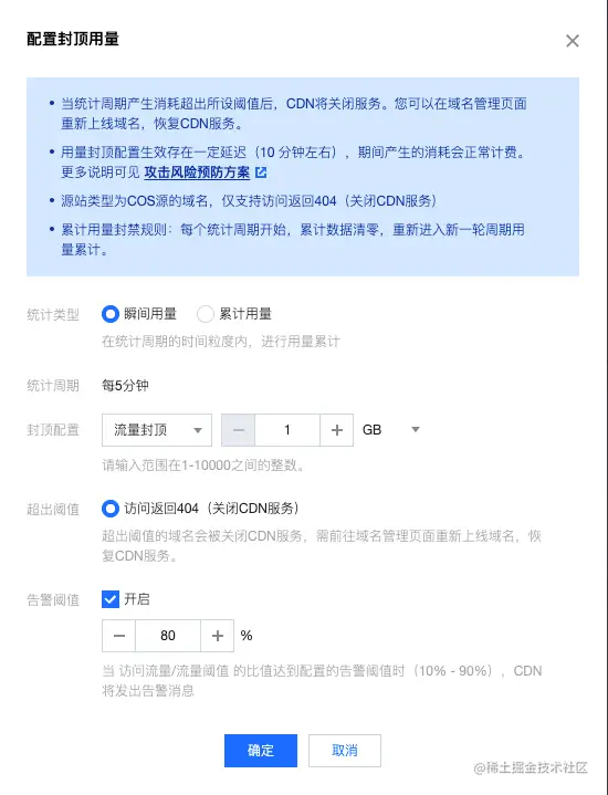 此方案即累积达量后的自动熔断服务方案,强烈建议配置此策略! 用量封顶策略可以配置5分钟级别的带宽峰值或累积流量阈值,也可以配置小时级别/天级别的流量累积阈值,并且支持"自动解封"