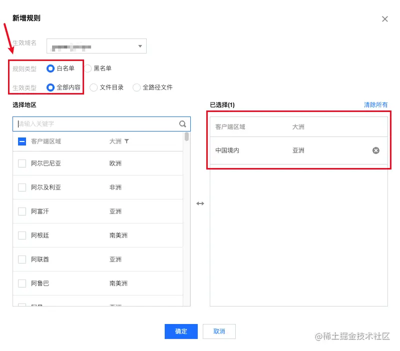 区域访问控制通过 Client IP 识别终端用户所在地,允许客户针对全部内容或者指定目录,设置各区域终端用户的访问权限。如开启白名单模式且只允许中国境内地区访问,针对上面小明的盗刷场景,可以非常有效的产生防护效果。