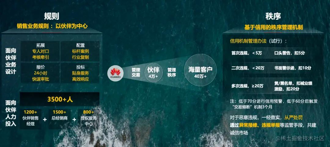 除了在各个环节做好伙伴的支持与服务,构建信任、开放合作模式的前提恰恰是规则和秩序。一个直接的例子,华为围绕伙伴的业务流程打造了涵盖获客、拓展、服务在内的一整套平台,相关人力投入超过3500人。同时还制定了完善的激励和秩序管理机制,为伙伴提供营销、线索、返点等资源,并通过异常报修、窜货举报等监管手段,对恶意违规行为从严处罚,旨在营造良好的商业环境,让生意简单高效。