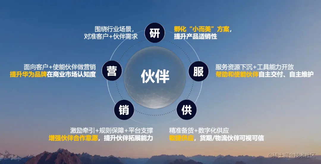 比如在研发层面,对准客户和伙伴的需求,孵化“小而美”方案并提升产品适销性;在营销层面,面向客户使能伙伴做营销,不断提升华为品牌在商业市场的认知度;在销售方面,通过激励牵引、规则保障和平台支撑,提升伙伴的拓展能力;在供应链方面,利用精准备货和数字化供应体系,产品货期、库存、物流均透明可查;在服务方面,通过服务资源的下沉和工具能力开放,帮助伙伴自主交付、自主维护。