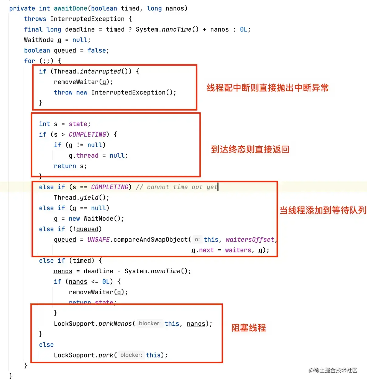 - 第三次循环时若任务还是为结束则会将当前线程通过 LockSupport 阻塞,若 get 指定了超时则阻塞的指定的超时时间,否则一直阻塞直到被主动唤醒。