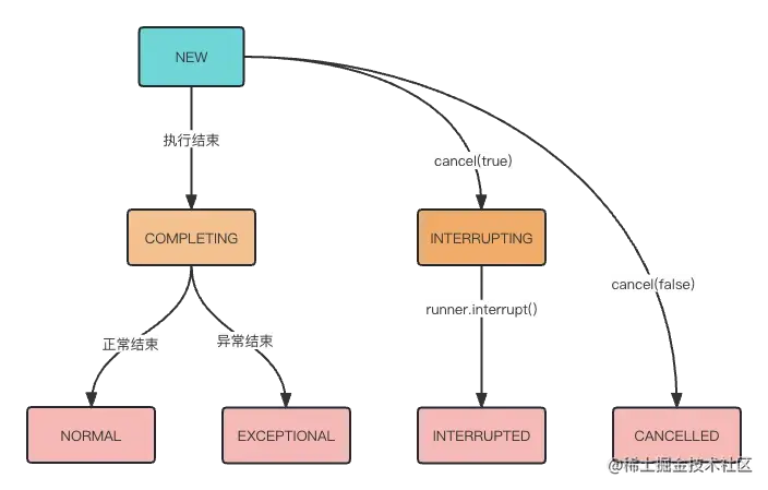 初始化时为 NEW 状态,NORMAL、EXCEPTIONAL、CANCELLED、INTERRUPTED 为终态,分别表示正常执行结束、执行抛出异常而结束、被取消、被中断。