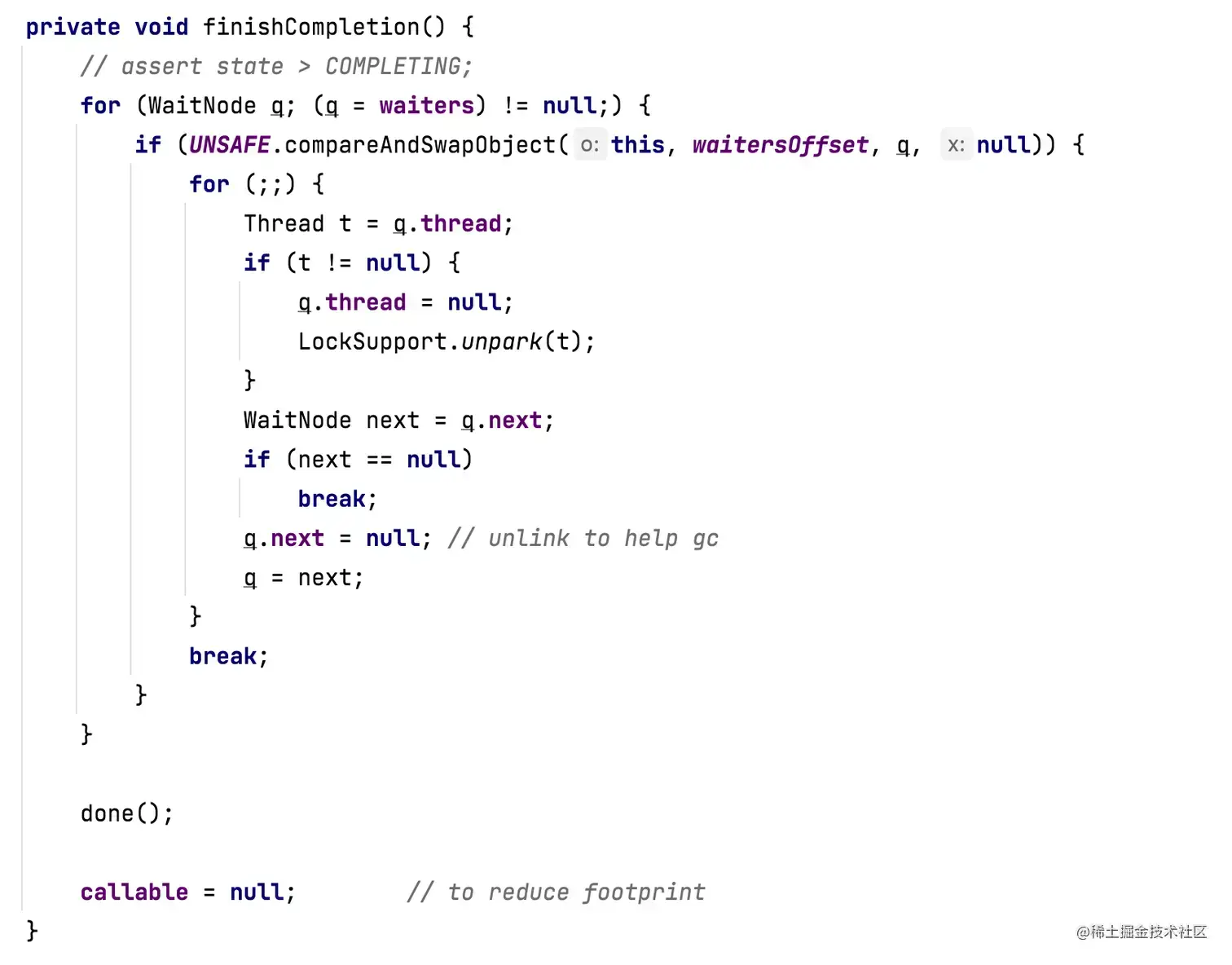 任务结果更新完成后就会通知到阻塞等待结果的线程。任务执行结束后遍历等待队列中的所有节点,将节点的被阻塞等待的线程逐个唤醒,并移除节点。这些操作由 finishCompletion 实现: