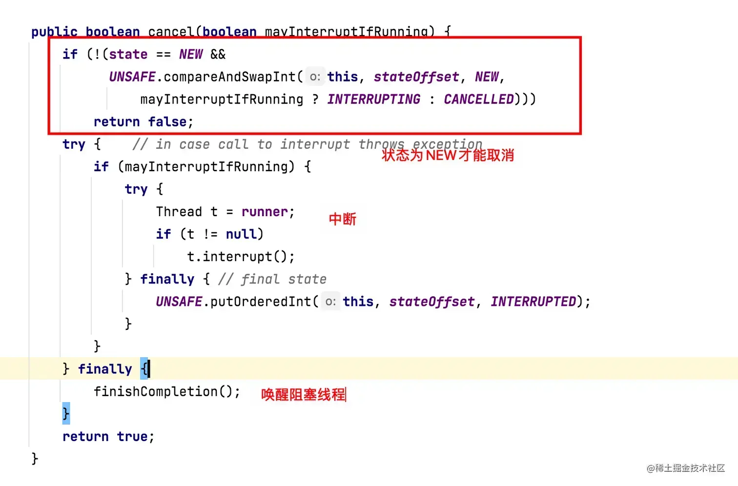 FutureTask 中只有状态为 NEW 时才可以 cancel,因为状态为 NEW 的任务表示还未执行或者还在执行中,若是其它状态则表示任务已经正常或异常执行结束。